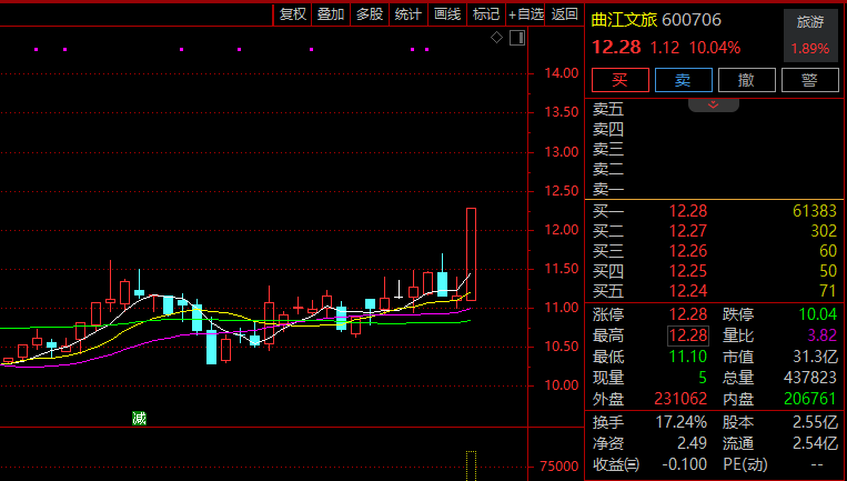 旅游股延续强势,板块指数盘中放量涨逾2%,连续第4日上扬,半日成交超昨日全天成交。曲江文旅(维权)(600706)垂直拉涨停,三峡旅游、西域旅游、大连圣亚、长白山等涨幅居前。